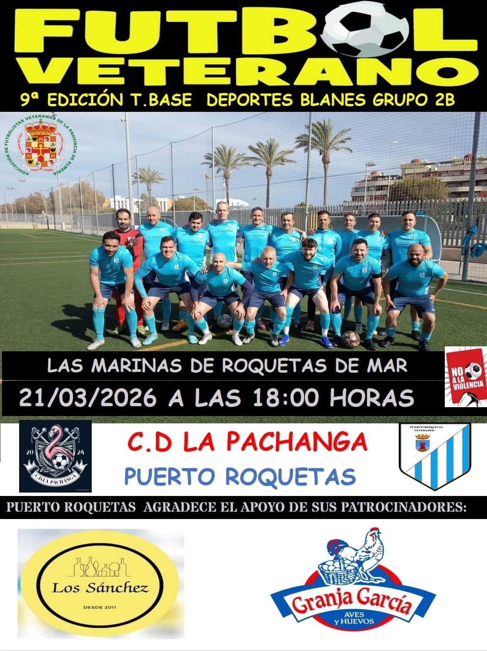EL SABADO 21 DEL PRESENTE SEIS DE LA TARDE EN EL COMPLEJO DEPORTIVO LAS MARINAS DE ROQUETAS DE MAR PARTIDO ENTRE EL C.D. LA PACHANGA Y TABERNA LOS SANCHEZ EL PUERTO CORRESPONDIENTE A LA CUARTA JORNADA DE LA NOVENA EDICION DEL TORNEO BASE DEPORTES BLANES SEGUNDA DIVISION GRUPO "B".