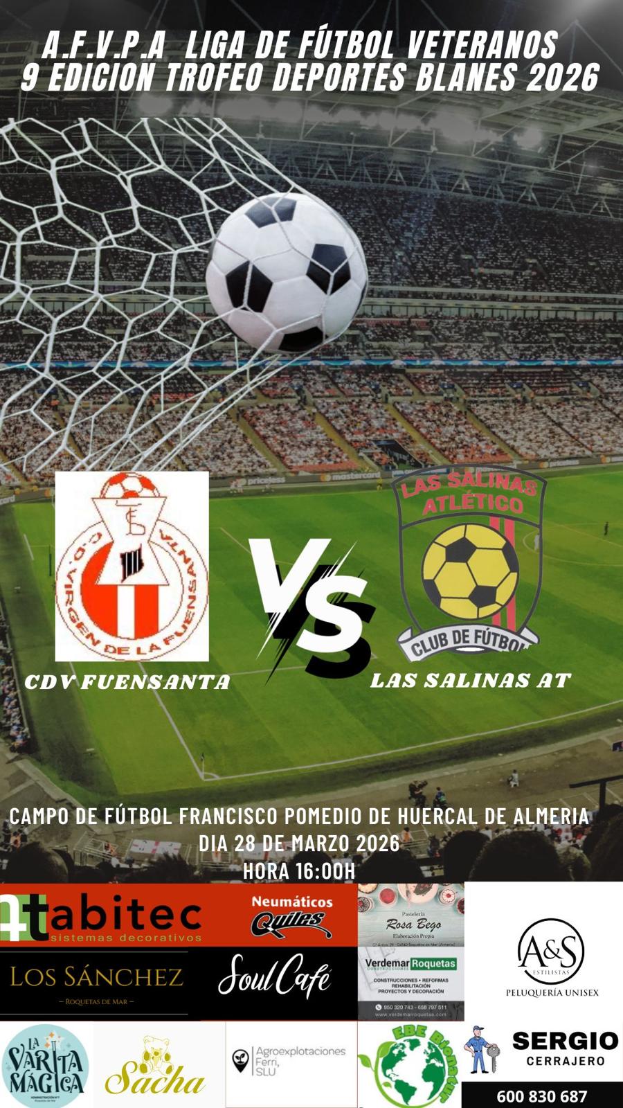 EL PROXIMO SABADO 28 DEL PRESENTE CUATRO DE LA TARDE EN EL MUNICIPAL FRANCISCO POMEDIO DE HUERCAL DE ALMERIA PARTIDO ENTRE C.D.V. FUENSANTA Y LAS SALINAS AT. CORRESPONDIENTE A LA QUINTA JORNADA DE LA NOVENA EDICION DEL TORNEO BASE DEPORTES BLANES PRIMERA DIVISION GRUPO "D".